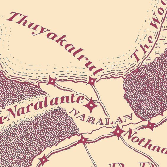 The Naralan is the corridor of land connecting the Guarded Land with the northern sea. Two of the Cities of the Sea lie on the shore of the Naralan. The greatest of these is Thuyakalrul