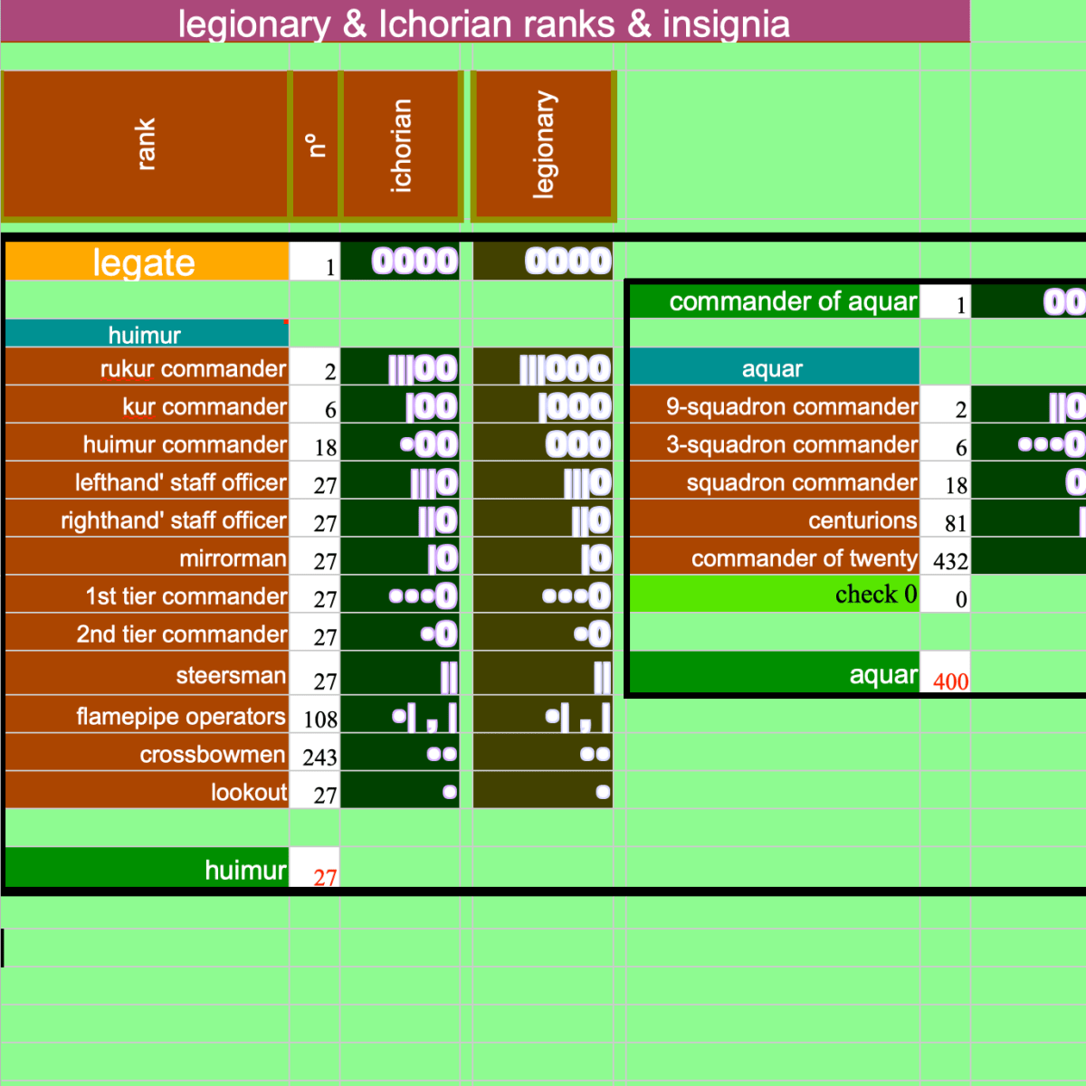The second diagram shows some of the work that culminated in the tables displayed in the first diagram. These tables show the ranks and insignia for the Ichorians, for legionaries and auxiliaries. Those displayed cover ruhuimur (or dragon) crews and auxiliary or other aquar-mounted forces. If you expand the image it will extend to cover legionary support staff.